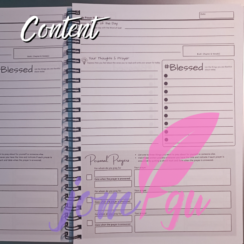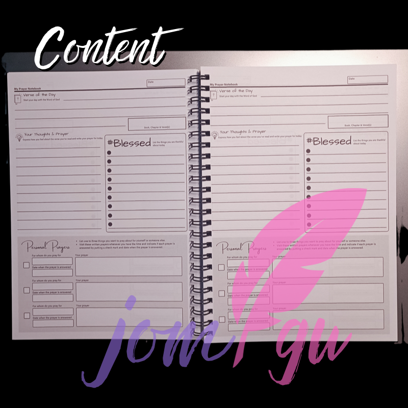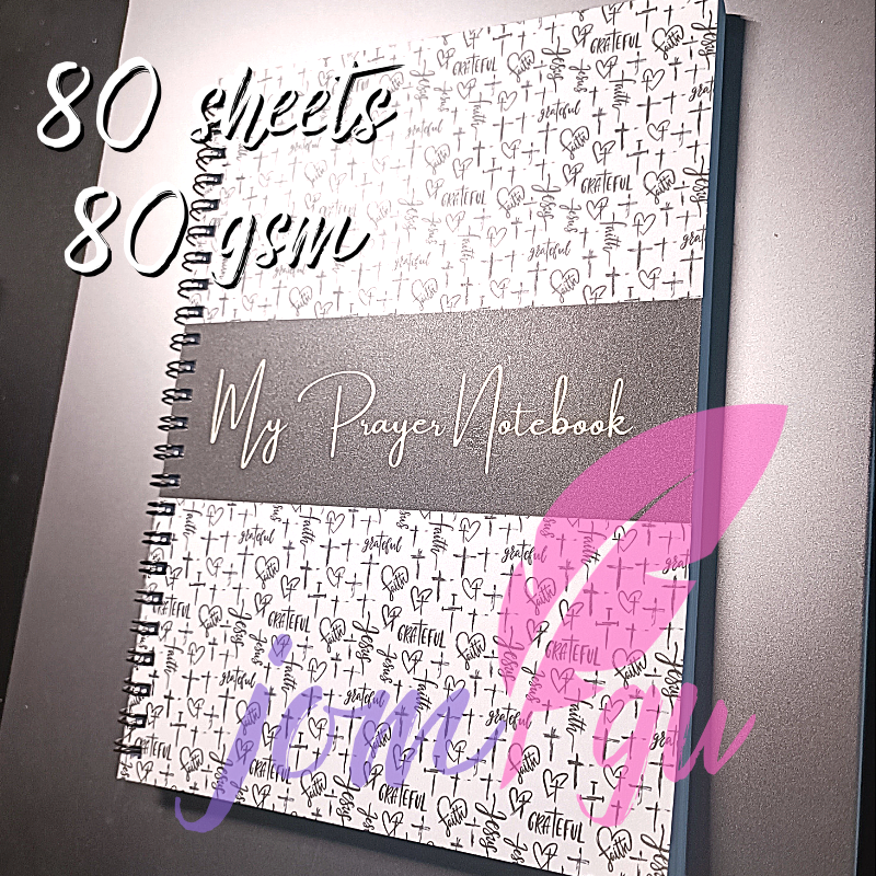 It is your daily prayer journal in notebook style - consisting of 85 sheets or 170 writable pages. You may write here your verse of the day and make a reflection on it and write your prayer about it. Also, you may list the things you are thankful for the day. We also added a table of your personal prayers per page. These are prayers which include your wish or prayer petition for yourself, a loved-one or another person or group. Each leaves of the notebook is 80gsm bound in double loop wire - A5 size.