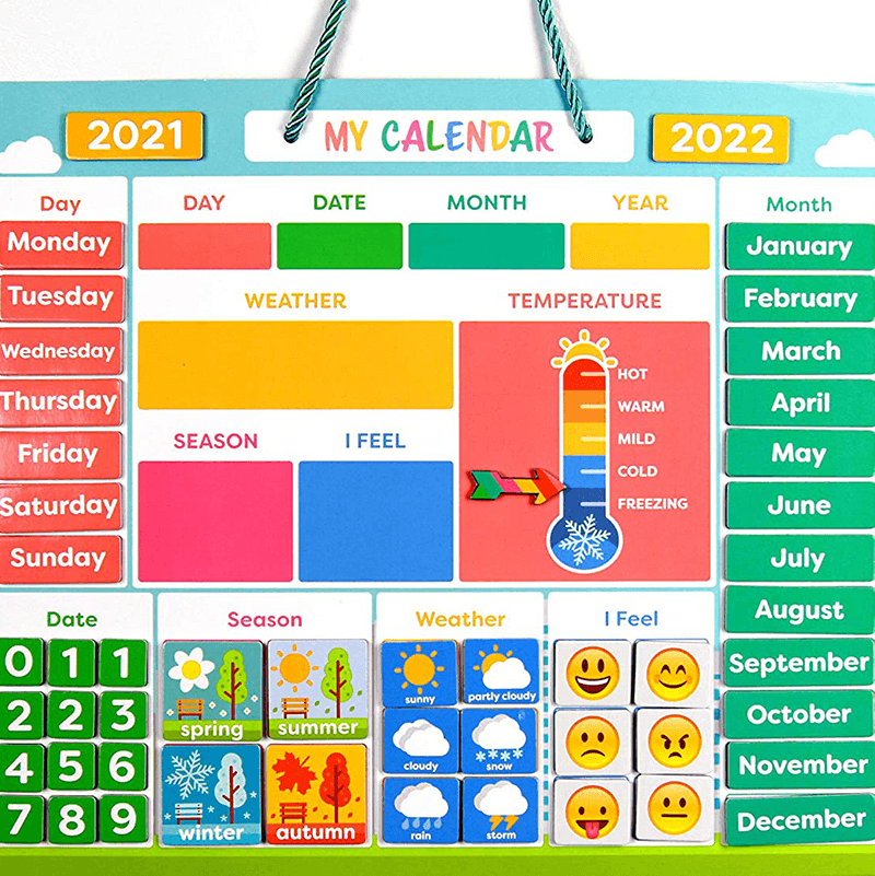 Magnetic Calendar and Weather Station for your kids to help them learn how to read dates, understand seasons, moods temperature and weather. The board can be hanged or attached to your refrigerator. The calendar is printed over a very thick and strong magnetic board which is designed to hold all the pieces. Includes years 2020, 2021 and 2022. Also perfect for preschool classrooms. Manufacturer: Brio Essentials ASIN: B076FVV44L Dimensions: 16.14 x 13.19 x 0.91 inches